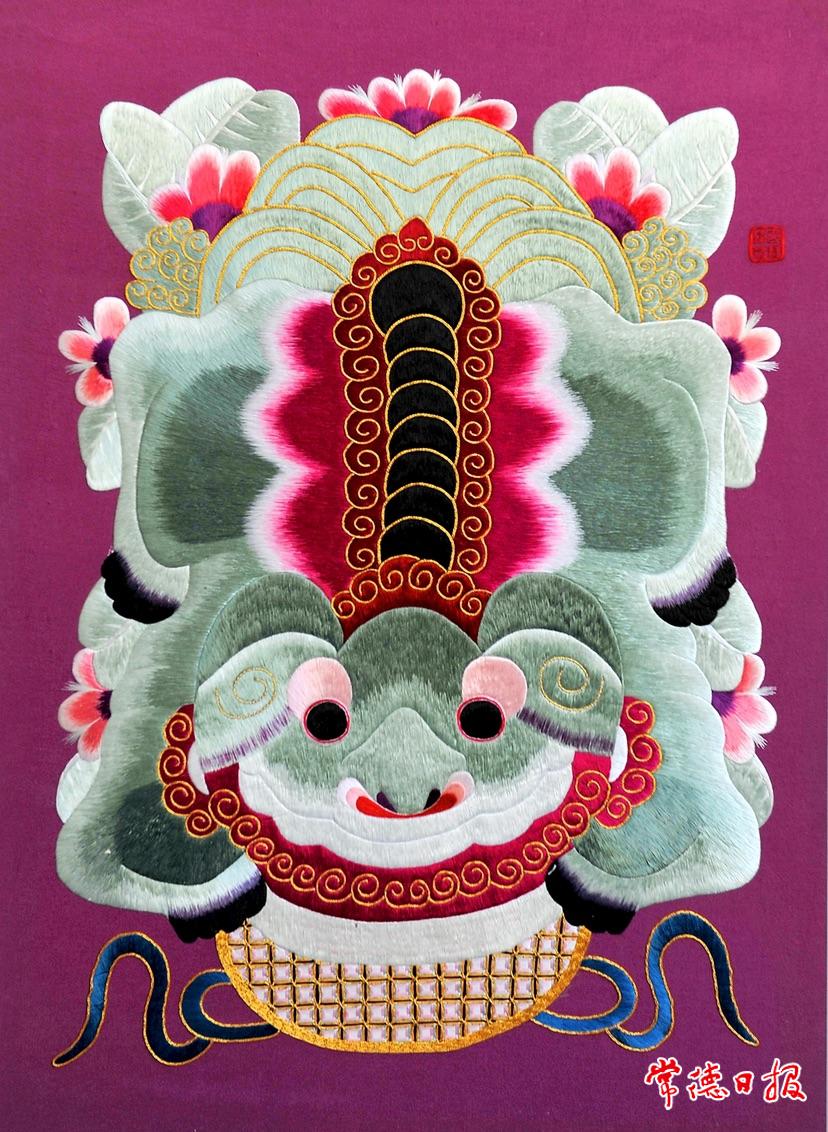 “桃源刺繡被譽(yù)為‘湘繡之魂’,在中國刺繡中也占有重要地位,我已整理出桃源刺繡的100余種針法,本次作品選用的是網(wǎng)格針,繡品平整細(xì)密,充分體現(xiàn)桃源刺繡的鮮明風(fēng)格。”肖瑤介紹。而為什么選繡麒麟?她說,麒麟是中國民間傳說中的神獸,古人云,麒麟出沒處,必有祥瑞,取好寓意。“這幅50*60厘米的作品從創(chuàng)意到構(gòu)圖再到一針一線地繡制,花了1個(gè)半月時(shí)間,麒麟造型憨萌討喜,是目前我最心儀的作品。”