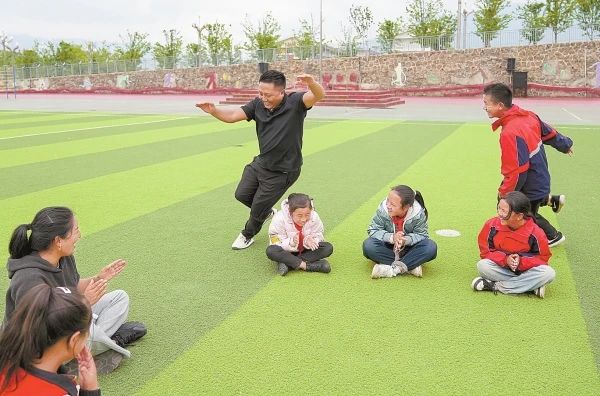 5月16日,昭覺縣第三小學,原懸崖村的學生和老師在做游戲。