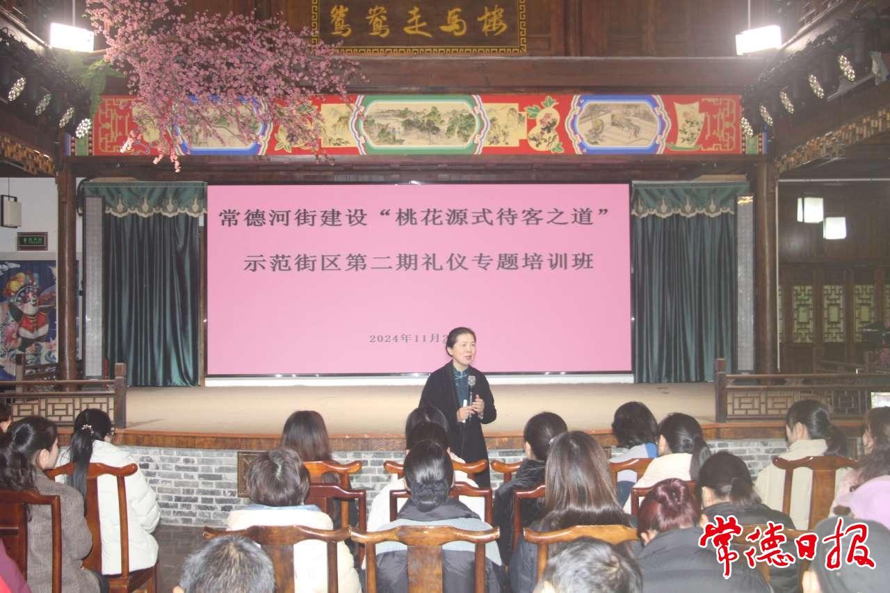 常德日報(bào)記者 李張念 文/圖 11月29日,常德河街建設(shè)“桃花源式待客之道”示范街區(qū)第二期禮儀專題培訓(xùn)班在常德河街鴛鴦走馬樓舉辦。
