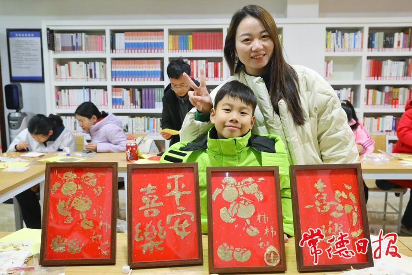 “金箔畫的制作過程有點難度,需要小心制作,稍有不慎就可能前功盡棄……”在工作人員的指導下,家長和孩子們紛紛拿起工具,開始了金箔畫制作體驗之旅。他們小心翼翼地將模具卡平鋪在紅色背景紙上,用膠水將圖案勾勒出來,待膠水半干后把一張張金箔紙鋪上并壓實,待膠水干透便清掃掉多余的金箔料,刷上金箔保護油并裝裱,親子間相互交流協作,分享彼此的創意和心得,現場氣氛熱烈而溫馨。不一會兒,“柿柿如意”“年年有魚”“平安喜樂”等字眼和各式各樣的吉祥圖案在孩子們的巧手中誕生,這些作品不僅是每個親子家庭對傳統技藝的傳承,也承載著他們對于新春佳節的美好祝愿。