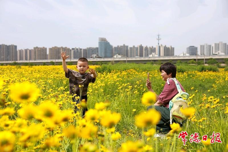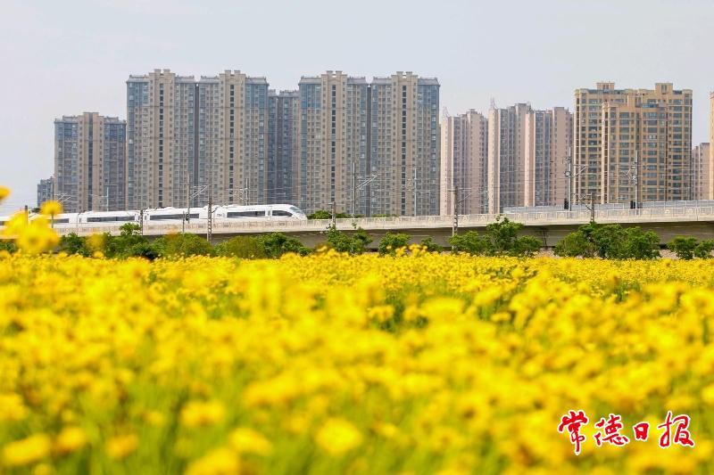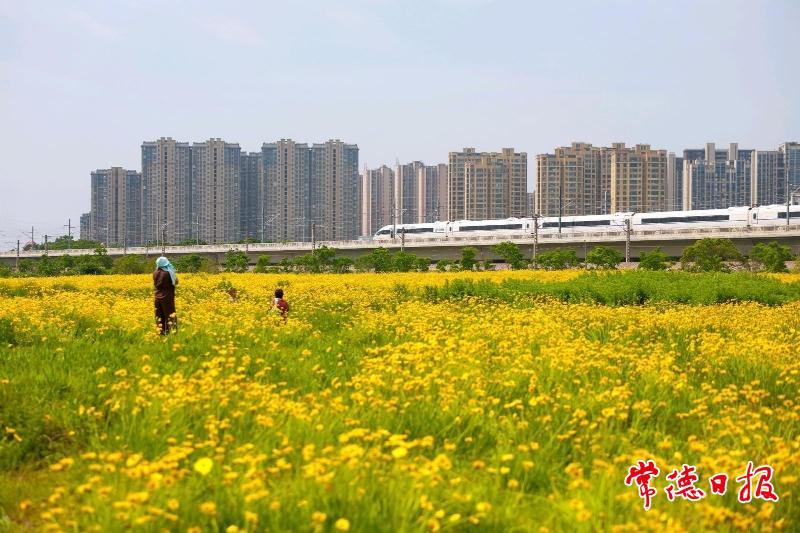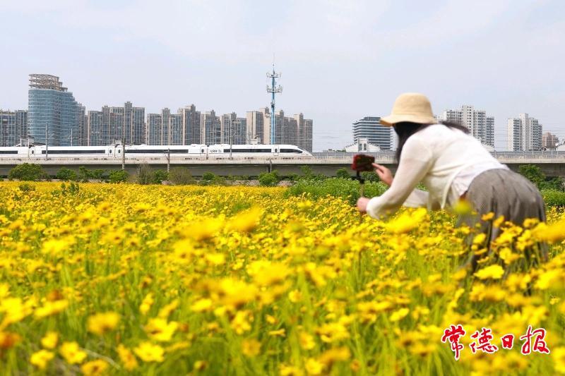 5月6日,在常德市城區(qū)太陽大道泰達(dá)潤景園小區(qū)對面,大片金雞菊燦爛綻放,金黃絢麗的景致美不勝收。呼嘯疾馳的高鐵,從這片“花海”間穿梭而過,引得眾多市民紛紛前來打卡,與高鐵同框。常德日報記者 蔡文龍 攝影報道