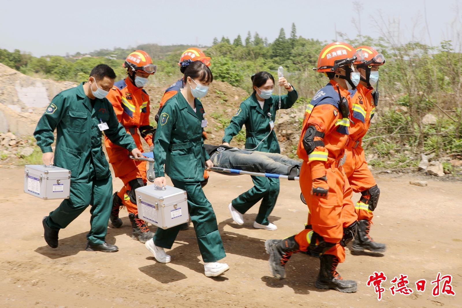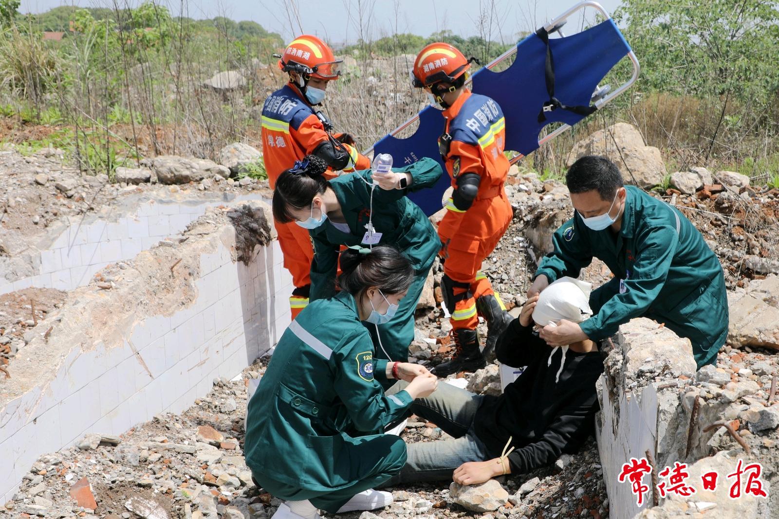 “報告,現場有居民頭部異物砸傷頭部外傷,請求醫療救援。”地震救援演練現場,模擬當地一居民小區因地震導致建筑坍塌人員被困受傷。接到報告后,消防員、醫院創傷急救中心醫護救援隊成員立即展開創傷現場醫療救護,為“受傷”居民包扎傷口、抬著他翻越殘垣斷壁,緊急護送居民到120救護車。