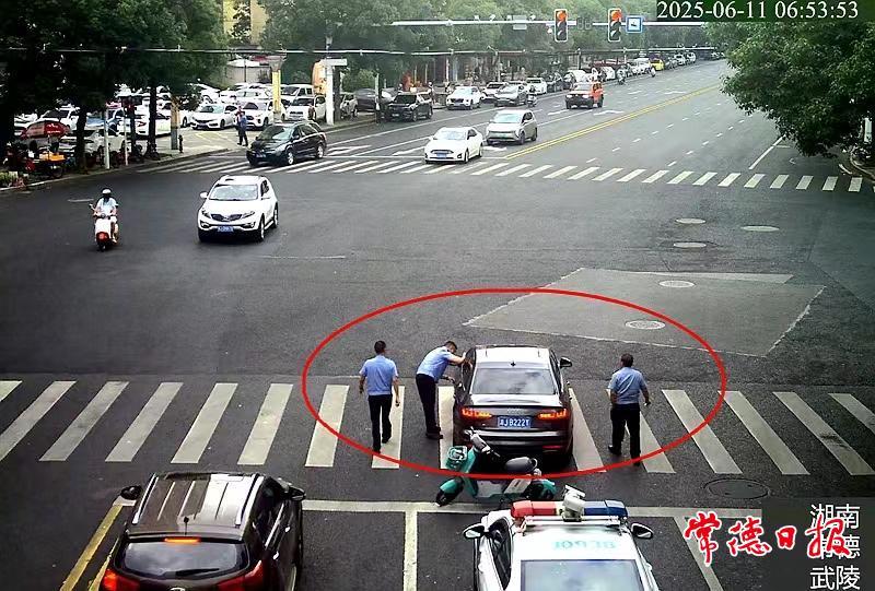 常德日報(bào)記者 王敏 通訊員 劉小滿 蘇瑩 文/圖 近日,市城區(qū)芙蓉路與竹葉路交會處,一輛黑色小車停在斑馬線上一動不動,路口車輛紛紛繞行,著實(shí)危險(xiǎn)。好心市民群眾從附近推來一輛共享單車設(shè)置臨時(shí)路障,并撥打110報(bào)警。
