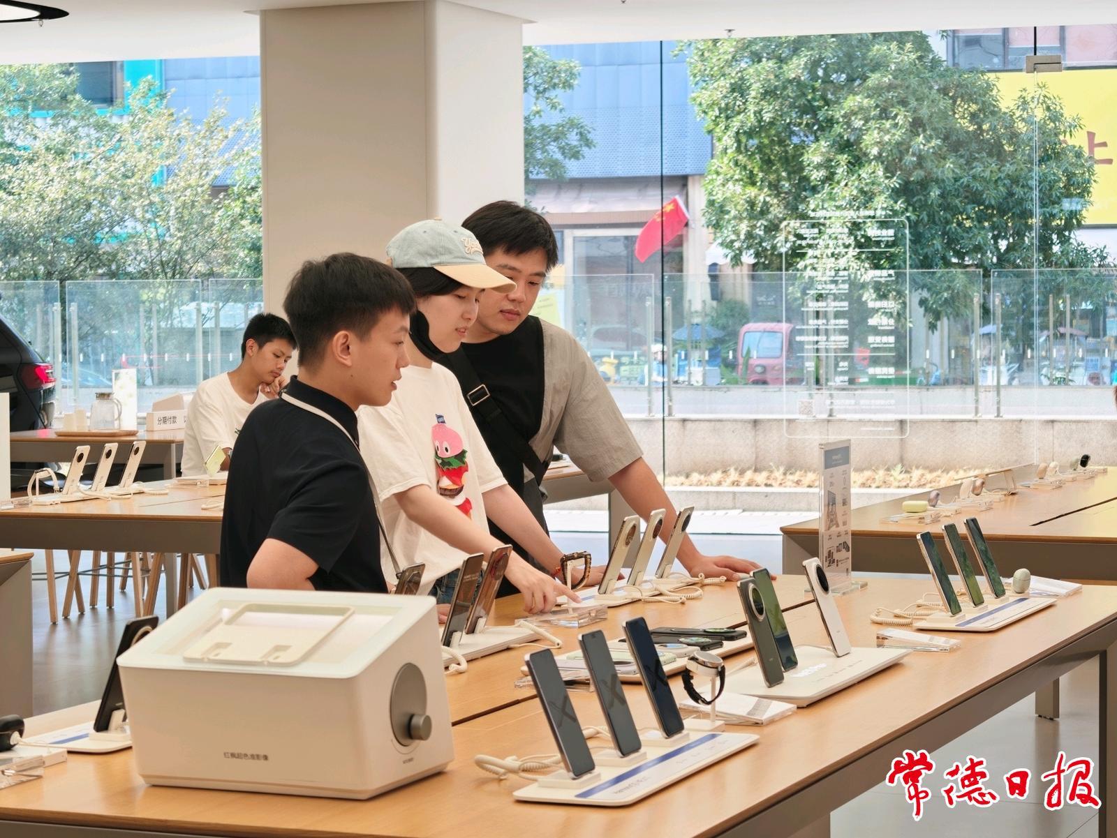 在常德萬達(dá)廣場各手機(jī)品牌體驗(yàn)店內(nèi),手機(jī)銷售區(qū)域格外熱鬧。不少市民,特別是即將步入大學(xué)的高中畢業(yè)生,正在仔細(xì)挑選心儀的智能手機(jī)、電腦等電子產(chǎn)品。導(dǎo)購人員穿梭忙碌,熱情地向顧客介紹產(chǎn)品性能和當(dāng)前的優(yōu)惠活動(dòng)。