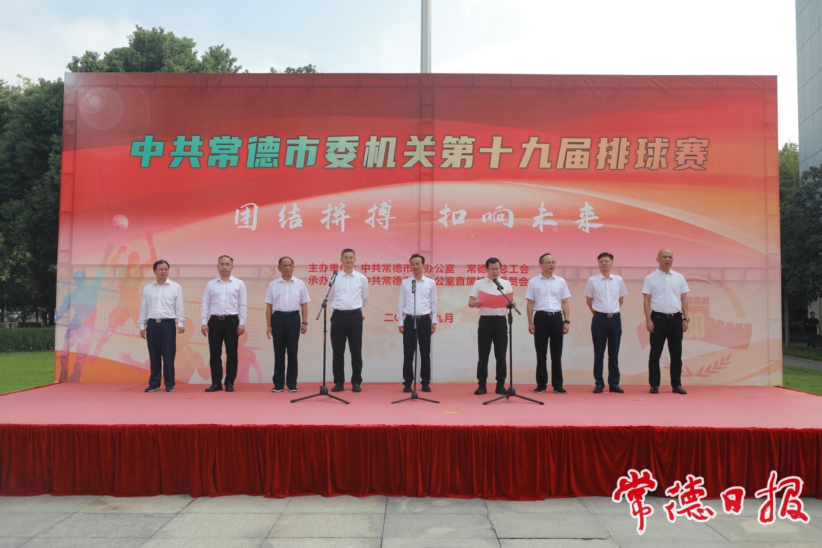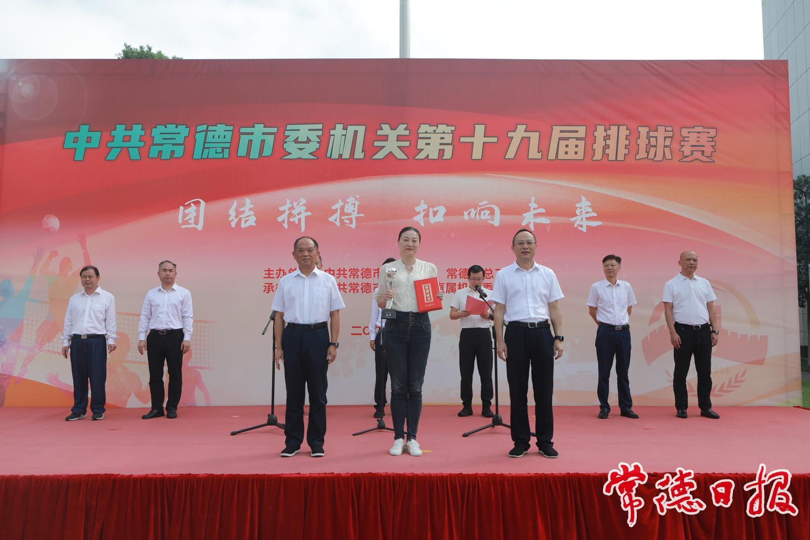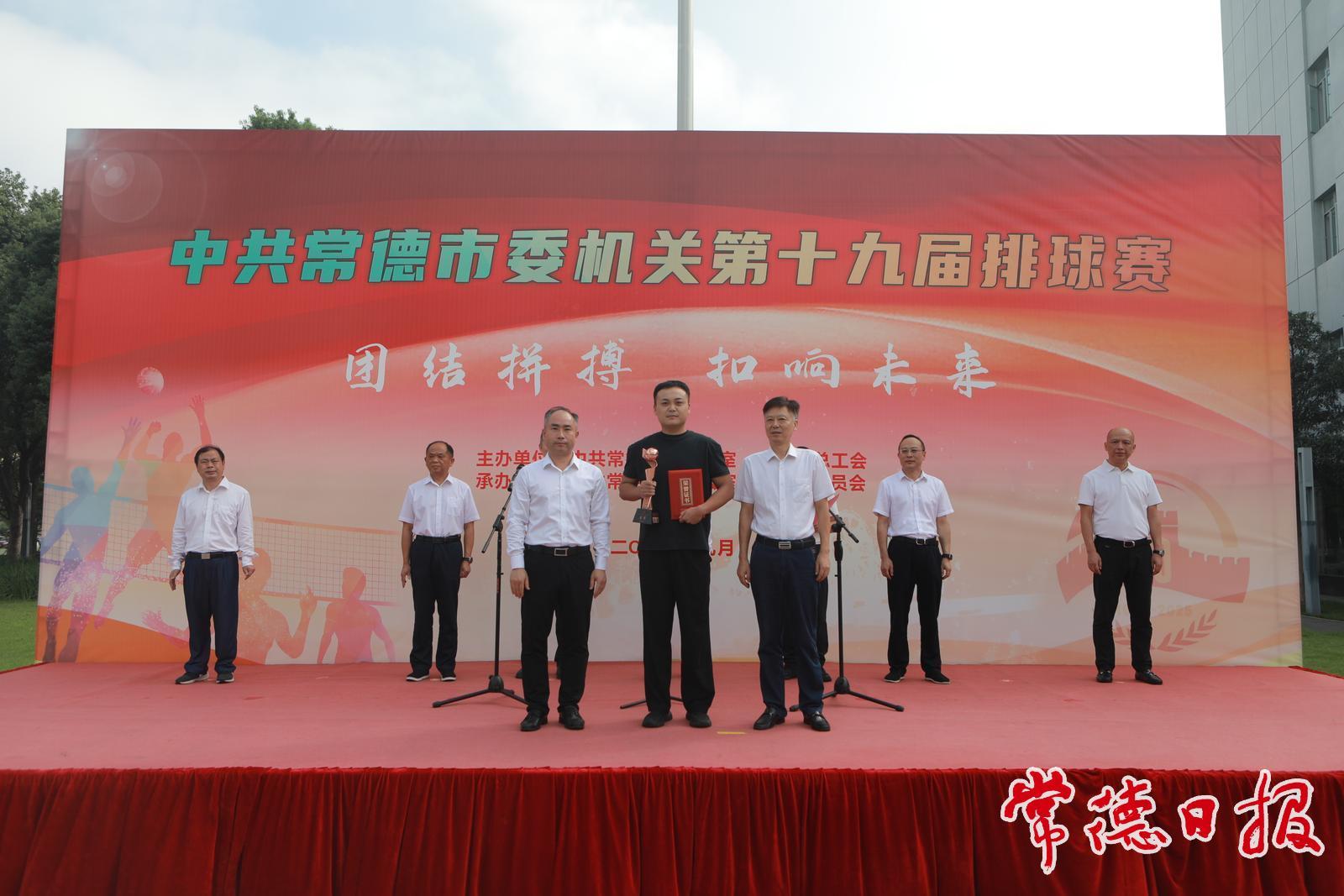 常德日報記者 王自來 文/圖 9月28日下午,“團結拼搏 ‘扣’響未來”中共常德市委機關第十九屆排球賽閉幕。市委常委、市委政法委書記、市委秘書長傅勇宣布比賽閉幕并為獲獎隊伍頒獎。