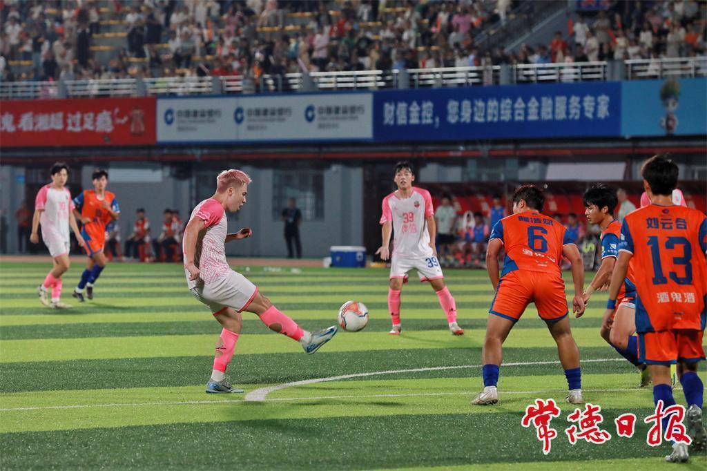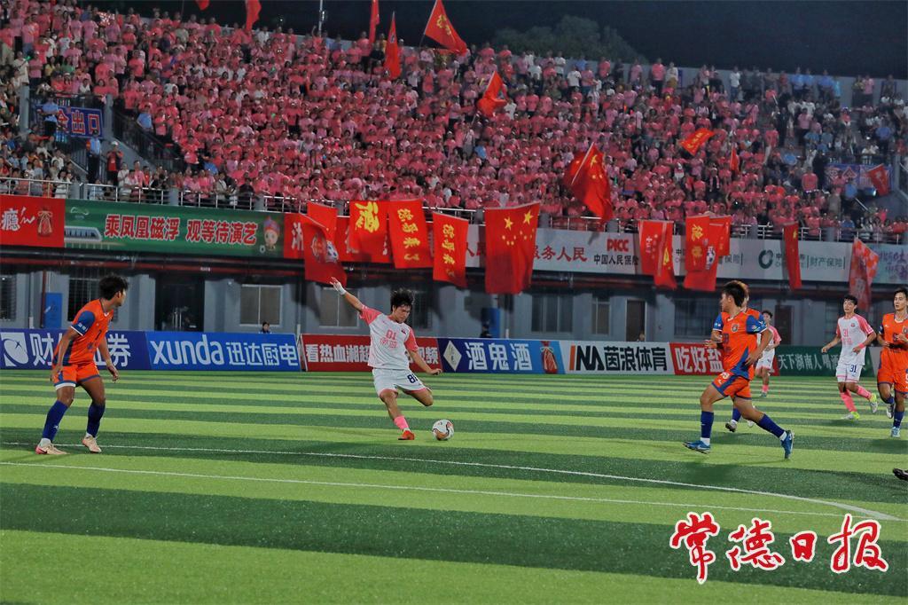 開場后,雙方都踢得比較開放,不斷適應(yīng)場地,在陣地戰(zhàn)中反復(fù)試探。常德隊左、右兩個邊路開場活躍,在快速反擊中頻頻下底傳中制造威脅。
