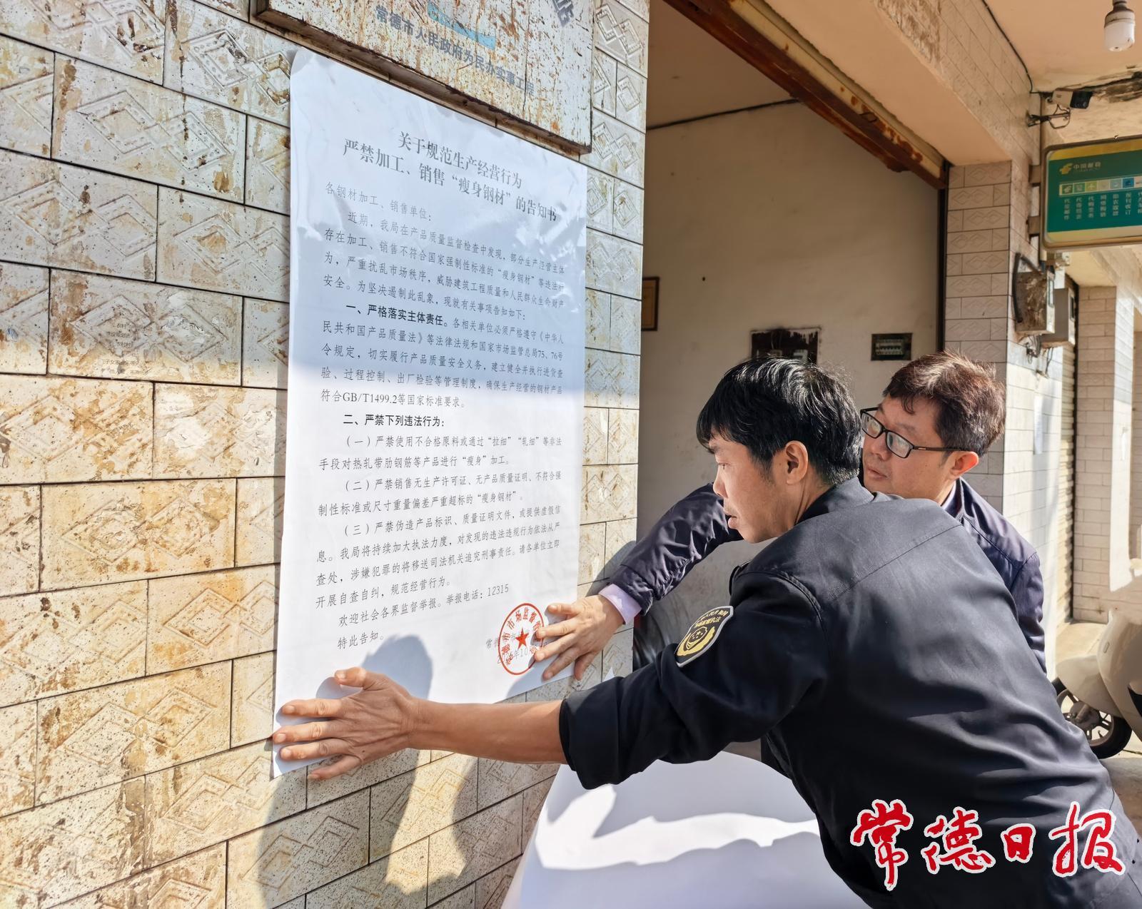 同時,執法人員在鋼筋產品經營門店醒目位置張貼《關于嚴禁加工、銷售“瘦身鋼材”的告知書》,發放鋼材產品質量安全普法宣傳資料,向經營者宣貫產品質量法律法規,督促其嚴格落實進貨查驗制度,強化主體責任意識,堅決守住產品質量安全底線。